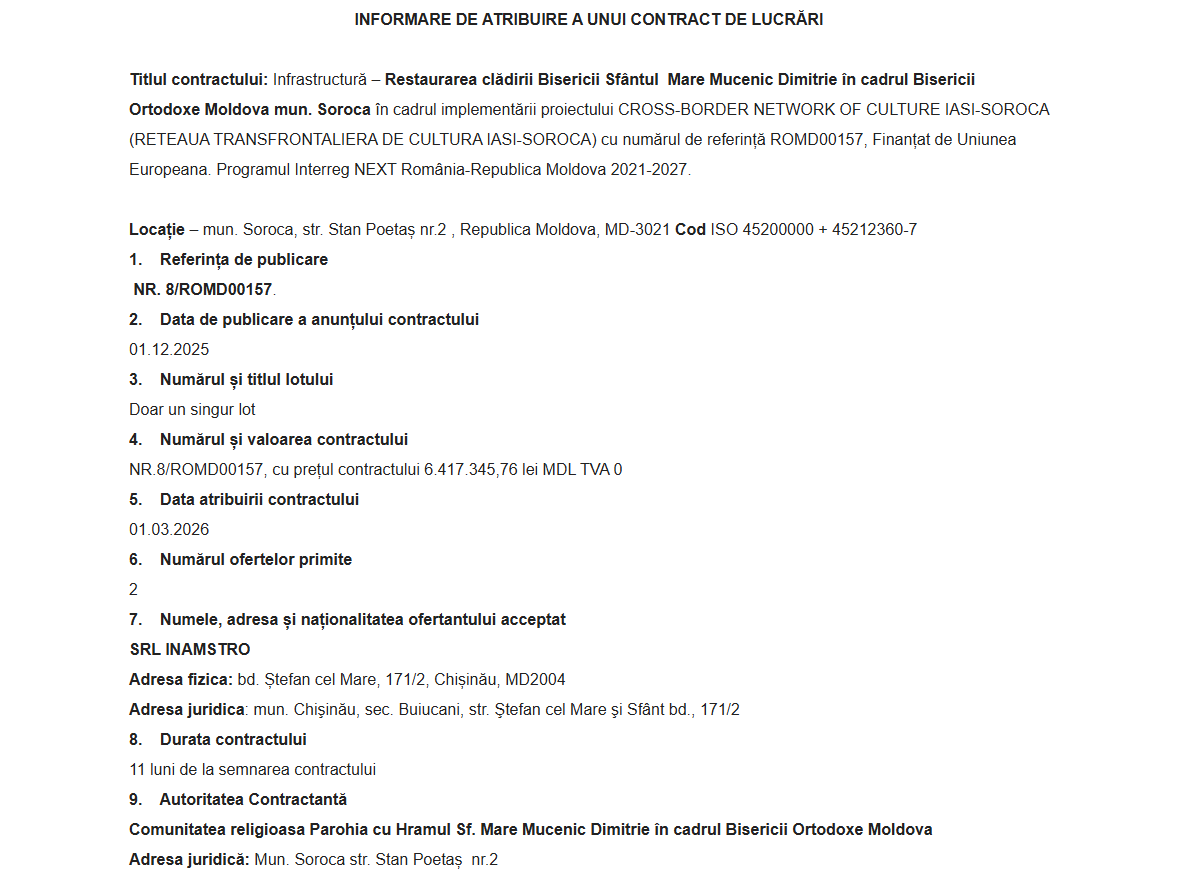 FacebookTweet FacebookTweet Navigare în articole ANUNȚ CONTRACT DE LUCRĂRI Au demarat lucrările de Restaurare a clădirii Bisericii „Sfântul Mare Mucenic Dimitrie” din mun. Soroca.